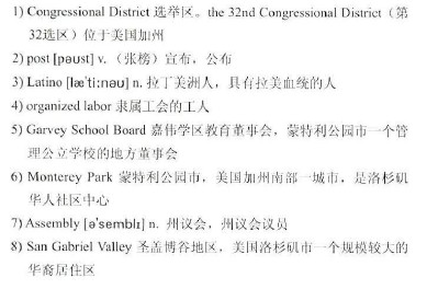 She won this election in much the same way she 2)posted earlier victories—expanding on her Asian base (about 13% of voters in the congressional district) to win support among 3)Latinos (who make up almost half of the registered voters in the district), 4)organized labor (a major element in the largely working-class district) and women. Her years on the 5)Garvey School Board and the 6)Monterey Park City Council and representing a local 7)Assembly district made her a trusted household name among 8)San Gabriel Valley political leaders, many of whom crossed party and ethnic lines to support her.