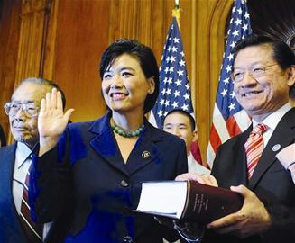 美国东部时间7月16日上午11时30分(北京时间7月17日零时30分),在美国众议院议长佩洛西的监督下,美国国会首位华裔女议员赵美心在华盛顿国会山宣誓就职。这一天她创造了美国华裔从政的新历史。她也是继吴振伟之后的第二位华裔国会议员。