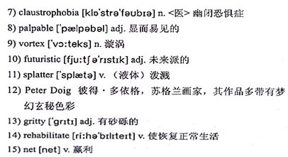 In some pieces, the 7)claustrophobia of prison life is 8)palpable; an anonymous painting titled Full House shows a crowded mass of uniformed figures, representing Britain’s swelling prison population. In a work called 9)Vortex, one of the potential exhibits in London, a 10)futuristic swirl of color is 11)splattered with red, blood-like paint. Another piece, entitled My World in Winter, is an abstract 12)Peter Doig-style picture that evokes the 13)gritty texture of the prison yard.