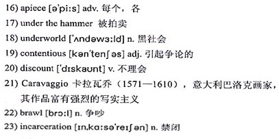 Therapeutic art programs are widely believed to help 14)rehabilitate criminals. Now they’re also generating controversial interest from critics and private collectors. Earlier this year, two paintings by London’s notorious Kray twins—who ran a violent gang called “the Firm” during the 1960s, were convicted of murder, and have since died—15)netted nearly £1,000 16)apiece when they went 17)under the hammer at a London auction house. “(People) imagine that the 18)underworld might be revealed by having access to this work,” says Walsh. “Suddenly the taboo life of people in prison is available to the public. Even if it’s not to fully understand (it), it’s just an attempt to try and glimpse that world. That desire is very compelling. That’s what’s driving this market.”