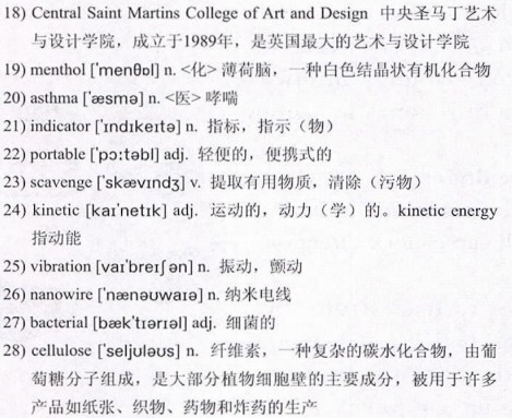 That’s only the beginning, though. Within the decade, we could see stores selling shirts that turn us into 22)portable power stations. Scientists are already looking to develop energy-23)scavenging fabrics, with nanotechnology built in that uses the 24)kinetic energy from the wearer’s movements and converts it into electricity for powering electronic devices—a similar principle, in fact, to the kinetic watches sold today. Such systems would be potentially life-saving for hikers and soldiers, but in the wider market could power mobile phones, MP3 players and more. Beyond this, scientists are examining how energy-scavenging fabrics could convert low-frequency 25)vibrations into electricity, using 26)nanowires entwined with the fabric’s fibers to avoid affecting the look of the clothing.