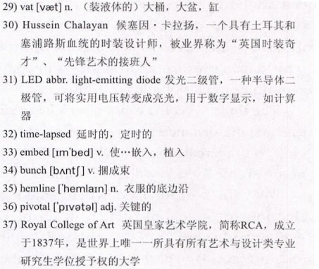 This may all seem like a distant dream, but it is not so far away. Science has long affected the way we dress, from the gradual improvement of wool and cotton production to the introduction of artificial fibers. In fact, some of these textile innovations are appearing on the catwalk. In 2008, 30)Hussein Chalayan brought his exquisite 31)LED dress to the catwalks of Tokyo. This video dress displayed a 32)time-lapsed image of a rose opening up and closing, with an array of colors and light, made possible by 15,000 LEDs 33)embedded in the fabric. Chalayan has also displayed clothes that changed shape before the spectator’s eyes: zippers closing, cloth 34)bunching and 35)hemlines rising without human assistance, thanks to the use of micro-controllers, switches and motors.