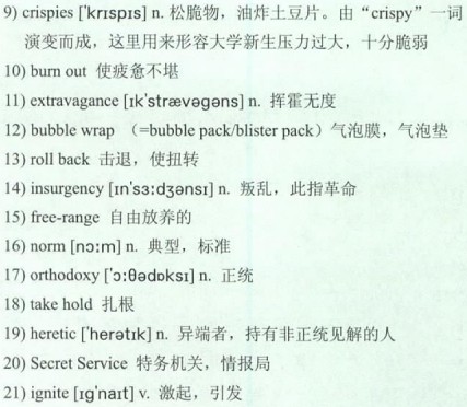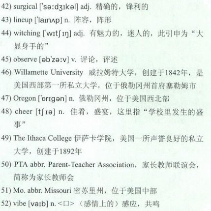 A certain amount of hovering is understandable when it comes to young children, but many educators are concerned when it persists through middle school and high school. Some teachers talk of “41)Stealth Fighter Parents,” who no longer hover constantly but can be counted on for a 42)surgical strike just when the high school musical is being cast or the starting 43)lineup chosen. And senior year is the 44)witching hour: “I think for a lot of parents, college admissions are like their grade report on how they did as a parent,” 45)observes Madeleine Rhyneer, Dean of Students at 46)Willamette University in 47)Oregon. Many colleges have had to invent a “director of parent programs” to run regional groups so moms and dads can meet fellow college parents or attend special classes where they can learn all the school 48)cheers. 49)The Ithaca College website offers a checklist of advice: “Visit (but not too often)”; “Communicate (but not too often)”; “Don’t worry (too much)”; “Expect change”; “Trust them.”