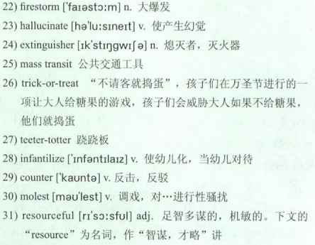 There is no rational reason, she argues, that a generation of parents who grew up walking alone to school, riding 25)mass transit, 26)trick-or-treating, and 27)teeter-tottering should be forbidding their kids to do the same. But somehow, she says, “10 is the new 2. We’re 28)infantilizing our kids into incompetence.” She celebrates seat belts and car seats and bike helmets and all the rational advances in child safety. It’s the irrational responses that make her crazy. When parents confront you with “How can you let him go to the store alone?” she suggests 29)countering with “How can you let him visit your relatives?” (Some 80% of kids who are 30)molested are victims of friends or relatives.) “I’m not saying that there is no danger in the world or that we shouldn’t be prepared,” she says. “But there is good and bad luck and fate and things beyond our ability to change. The way kids learn to be 31)resourceful is by having to use their resources.”