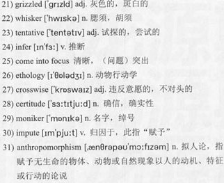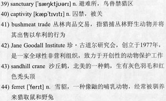 She now spends about 300 days a year on the road, giving countless interviews and schoolroom talks, lecturing in big venues, meeting with government officials, raising money to turn the wheels of the 42)Jane Goodall Institute. Occasionally she sneaks away into a forest or onto a prairie, sometimes with a few friends, to watch chimps or 43)sandhill cranes or black-footed 44)ferrets and to restore her energy and sanity. It’s important to remember that the meaning of Gombe, after half a century, is bigger than Jane Goodall’s life and work. But make no mistake: Her life and work have been very, very big.