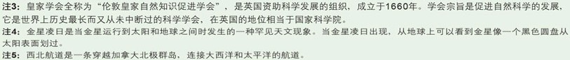 Following the war, Cook's skill at navigation and interest in 11)astronomy made him the perfect 12)candidate to lead an 13)expedition planned by the Royal Society注3 and Royal Navy to Tahiti to observe the transit of Venus注4 across the sun. Precise measurements of this event were needed worldwide in order to determine the distance between the earth and sun.