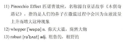 Scientists found that when you lie, chemicals known as 9)catecholamine’s are released, causing 10)tissue inside the nose to swell. They used special imaging cameras that show blood flow in the body to reveal that intentional lying also causes an increase in blood pressure. This technology indicates that the human nose actually expands with blood during lying, and is known as the “11)Pinocchio Effect”.