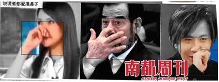 这个手势对撒谎者着实有用,因此可算是最有趣的说谎小动作之一。摸鼻子的手势有时是用手在鼻子下迅速摩擦几下,有时可能只是轻触一下,旁人几乎察觉不到。女人做这个动作时,幅度比男人小,也许是怕弄花妆容。