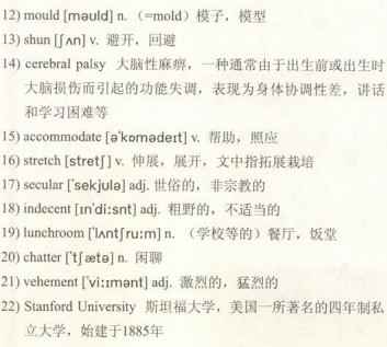 Not all home-schoolers 13)shun the public schools for religious reasons. Anne Mitchell, for example, pulled her son Gordon out because she did not like the way his school dealt with his 14)cerebral palsy. Rather than helping him to do things himself, it assigned a helper to follow him around and do everything for him. A tenth of home-schooling parents say that one of their children has a physical or mental problem that the local school cannot or will not 15)accommodate. And some parents teach at home because their children are brilliant and public school fails to 16)stretch them. American public schools are rigidly 17)secular. Private schools are expensive. For parents who want their children to grow up relatively unexposed to doubt or 18)indecent 19)lunchroom 20)chatter, home-schooling offers hope.
