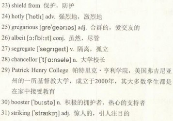 But parents make no apology for 23)shielding their children from what they see as bad influences. They 24)hotly deny that children learn better social skills on a school playground than at home. The children we met in Georgia were confident, 25)gregarious and socialised a lot, 26)albeit mostly with families doing the same thing. They were also at ease with friends of different ages. Public-school kids, by contrast, live in an “age-27)segregated herd”, scoffs Michael Farris, the 28)chancellor of 29)Patrick Henry College, a Christian university in Virginia most of whose students were taught at home.