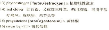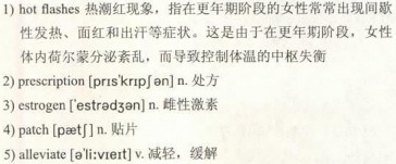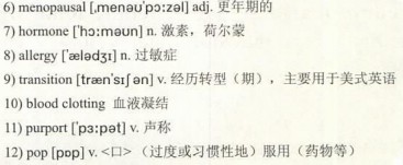 Meanwhile, more and more women bothered by symptoms are searching for a natural alternative, including natural supplements and regular exercise program. They may try, for example, a supplement of 13)phytoestrogens derived from soy and 14)red clover, a low-dose 15)progesterone cream, or 16)swear by black 17)cohosh 18)capsules. “Now, so many women I speak with want to go natural.” said Giblin. Instead of resorting to drugs, a large number of women tend to ease the symptoms in a “primitive” way.