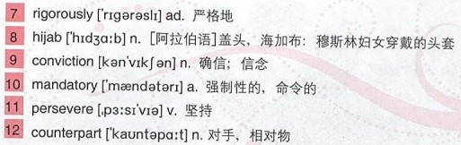 Before they reach 3)puberty, girls and boys may play together. But, beyond that, interaction between them, if they are not blood relatives, will be considered a serious offence. Many Iranians, especially men, have strong opinions about their women playing football, but there actually is nothing in Iranian law that 4)prohibits a woman from doing so, but only if she 5)abides by certain conditions. There are strict laws in place to protect a woman’s 6)modesty, and they are 7)rigorously enforced by the Iranian government. In Islam, the wearing of the 8)hijab, a head scarf, is a measure of a woman’s 9)conviction to God. In Iran, it is 10)mandatory.