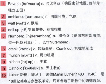 Long a center of toy-making in Germany, a woody and traditional 2)ambiance prevails. Nutcrackers are characters of authority, uniformed, strong-jawed and able to crack the tough nuts. Smokers, with their fragrant incense 3)wafting, feature common folk like this village toy-maker. Prune people, with their fig body, walnut head and prune limbs, are 4)dolled up in Bavarian folk costumes. And hovering above it all is the golden “rausch angel”, an icon of Christmas in 5)Nürnberg. Rausch is the sound of wind blowing through its wings. It’s a favorite for capping family Christmas trees.