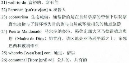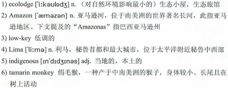 Holle and his business partner, a fellow 21)well-to-do white 22)Peruvian named Eduardo Nycander, got into the 23)ecotourism business in their early 20s using start-up money from friends and family. After founding Rainforest Expeditions in 1989, they built a couple of successful ecolodges aimed mainly at European tourists, whose longer vacations gave them time to get to lodges deep in the jungle. They wanted to build a lodge closer to the provincial capital, 24)Puerto Maldonado, so they could attract Americans, who often had only three or four days to visit the Amazon while in Peru. At about that time, they received a letter from a local chief asking them to build a lodge on his community’s land to provide jobs.