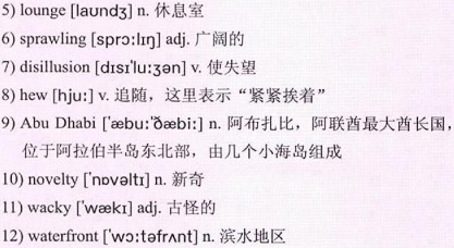 I don’t mean to sound like an undergrad philosophy major, but in Dubai I have no choice. Again and again, I find myself pondering the nature of reality. Sure, the city is a real place populated by real people—1.32 million, last anyone checked. But it has the look and feel of fiction, like a landscape inside a computer game. 2)Bizarre objects 3)pop up at odd 4)intervals. As it turns out, some of the astonishing sights I’m hoping to see simply don’t exist and likely never will. Missing in action is the Dynamic Tower, an 80-story building in which each individual floor revolves 360 degrees—like a quavering stack of hotel cocktail 5)lounges—and generates energy as it turns. Indeed, Dubai, fiercely sunny, dusty, and 6)sprawling, can be as 7)disillusioning as Las Vegas when the neon signs are off. Most of the newer buildings 8)hew close to the Sheikh Zayed strip, a straight line stretching all the way to 9)Abu Dhabi, originally laid through uninhabited desert. 10)Novelty high-rises face off across six lanes of traffic like opposing pieces in a 11)wacky chess set. There are developments under way the size of whole cities, like 12)Waterfront, an urban habitat for 1.5 million people, with a Manhattan-inspired downtown planned with the help of Dutch architect Rem Koolhaas. And there’s Bawadi, a six-mile-long entertainment district with 51 new hotels, including Asia Asia, predicted to be the world’s largest, with 6,500 rooms. And there’s Business Bay, a new central district with 220 skyscrapers going up all at once.
