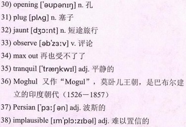 Actually, I think 100 years is an understatement—1,000 years’ worth of city in a decade is more like it. Every 10 seconds I alternate between profound admiration and sheer terror. And one afternoon I 34)max out on the whole big-is-beautiful ethos. I seek refuge in the Palace, a newly opened “historic” Arabian hotel, part of a freshly minted district called Old Town. I sink into a comfortable chair in the Palace’s 35)tranquil 36)Moghul-themed lobby, and then notice that what I’ve got in front of me is the best possible view of a 21st-century icon. There, beyond the 37)Persian arches of the shaded terrace, the lush gardens, and the pool, looms the Burj Dubai. And I figure that this is it—reality, Dubai-style—sipping tea while staring across the ages from a make-believe version of the 16th century to a somewhat 38)implausible version of the 21st.