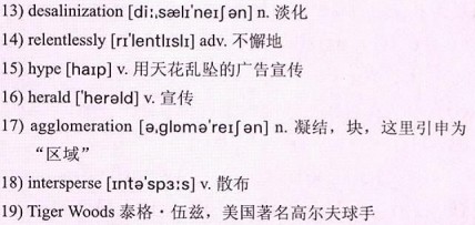 What I keep hearing during my visit is that the Dubai I can see is nothing compared with the Dubai that will soon emerge. Half of what’s printed on the map isn’t really here yet; vast tracts are marked u/c, meaning “under construction.” Also, despite the fact that the present-day city is built on big cars, aggressive air-conditioning, and energy-eating seawater 13)desalinization plants, green architecture is now the law of the land. Over at the firm FXFowle International, managing director Steven Miller speaks for most Dubai-based architects when he says, “It’s like I died and I’m already in heaven.” Even the things I think I know about Dubai, projects that have been 14)relentlessly 15)hyped, turn out to be both more and less real than I’d imagined. For instance, I’ve heard plenty about the Palms, three enormous clusters of islands made in the shape of trees, and The World, 300 artificial islands representing every country and landmass.
