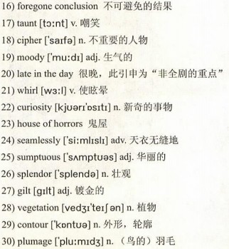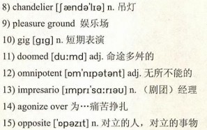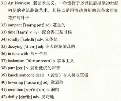 What one cannot doubt is the technical excellence of Jack O’Brien’s 24)seamlessly fluent, 25)sumptuous production, as well as the 26)splendor of the orchestra which pours forth Lloyd Webber’s dark-hued, yearning melodies as if life depended on them. Special praise should go to the lyrical lavishness of Bob Crowley and Jon Driscoll’s designs, with their 27)gilt interiors where the 28)vegetation-imitating 29)contours and giant peacock-30)plumage of 31)Art Nouveau run 32)rampant, and their ghostly external locations where a brilliantly deployed combination of flowing projection (33)timed to perfection with emotional and rhythmic shifts in the music) and 34)solidly presented stage-effects create a 35)dizzying Coney Island of the mind. Jack O’Brien’s production seems entirely 36)in tune with Lloyd Webber’s vision, conjuring a world of bright electric lights and dark shadows, fastened37)hedonism and hearts that have turned corrupted with jealousy and hatred.