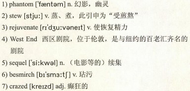 To think that all this time that poor, old, half-faced composer hasn’t been dead at all, just 2)stewing in his lust for greater glory. Being the title character of The Phantom of the Opera, the most successful musical of all time, wasn’t enough for him. He was determined to return—with different material and a 3)rejuvenated body—to the scene of his first triumph. So now he’s back, first in the 4)West End, later in different areas of the whole world.