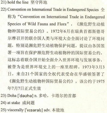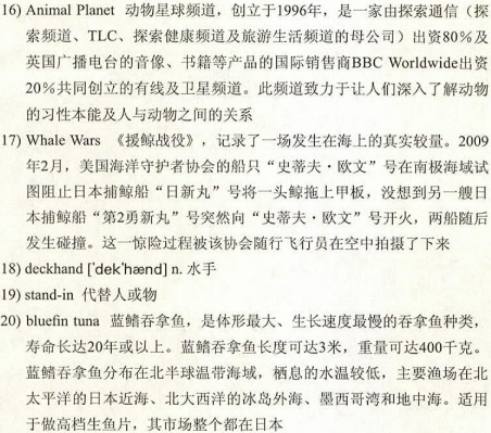 But neither is Japan. In part, the Japanese may be protecting their right to whale as a 19)stand-in for a separate issue they actually care about: fishing for20)bluefin tuna, which is popular in sushi. The Japanese eat an estimated 80% of the world’s catch of the species, which many scientists believe is in danger of being fished out of existence. If Japan21)holds the line on whaling, the argument goes, it would send a signal that limits on bluefin tuna aren’t up for debate either.