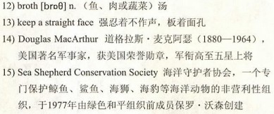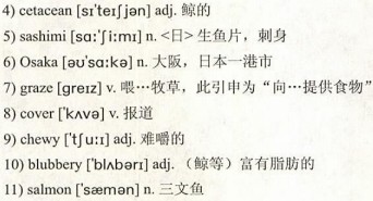 So I had to try it. When you 8)cover a whale-tasting event, you have to taste whale. And morality aside, I can tell you that whale meat isn’t good. As sushi and sashimi, it was fatty and 9)chewy with a bland, 10)blubbery taste—like 11)salmon that’s been kept out too long. The one exception was the whale noodle dish, but I’m going to say its success had more to do with the noodles and spicy 12)broth than it did with the whale. All in all, the experience made it hard for me to 13)keep a straight face when people referred to whale as a “delicacy.” It was like eating leftovers from a submarine.