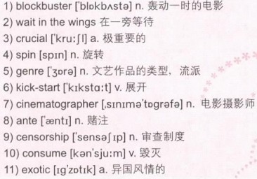 Some of China’s biggest 1)blockbusters were shot here. These films have conquered the world. They’re the international face of Chinese cinema. But for every international blockbuster, there are hundreds 2)waiting in the wings. Many excellent Chinese movies play in cinemas at home, but only a few make it abroad. Yet the foreign market is 3)crucial for the Chinese film industry. Some directors use the Hollywood style to grab the international audience; others put a different 4)spin on things.