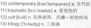 Korea’s 11)traumatic past is seen not only in films about war and division, but in violent action films. Some of the most popular have been directed by Chan-wook Park. He found international 12)cult status with his Vengeance 13)trilogy: Sympathy for Mr. Vengeance, Old Boy and Sympathy for Lady Vengeance.
