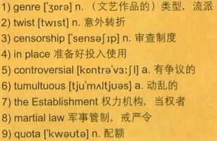 The South Korean film industry really took off after democratic elections in 1987.The following year, with a new constitution, the strict 3)censorship, that had been 4)in place since the war, began to ease. South Korean directors now had the opportunity to explore other 5)controversial subjects from the country’s 6)tumultuous history. With this new-found freedom, filmmakers started to question the authority of 7)the Establishment, including police and justice under 8)martial law.
