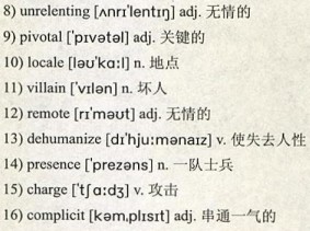 That whole story was of a war that many Americans could not fully visualize, then and now. The 9)pivotal moments of the European war featured 10)locales people had heard of and been to—the bombing of London, the liberation of Paris, and so on—and there was a central 11)villain, Hitler, who was known to all. As in Band of Brothers, the enemy is a 12)remote, mostly 13)dehumanized 14)presence—or a15)charging, immediate one that the 16)complicit viewer is only too happy to see shot down, blown up, or stabbed clean through. But the troops sent to try to stop the Japanese from taking over the South Pacific were, for the most part, going to obscure islands.