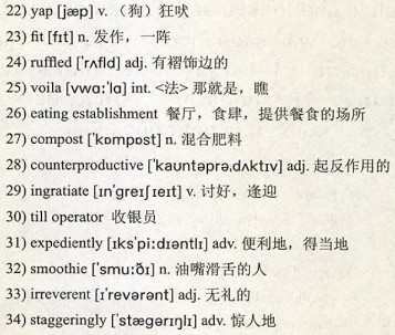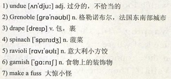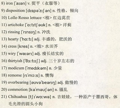 Only three days earlier, on a cobblestone square in Aix-en-Provence, I had been served a salad with 10)Lollo Rosso lettuce, 11)artichoke hearts, pine nuts, and dirt. Not a modest little dusting of dirt, crunching between my teeth, revealing a somewhat superficial 12)rinsing, but a 13)hearty clump of good, French soil. I could have grown 14)cress in it. I showed the waitress, a 15)wiry, 16)thirtyish woman, expecting a 17)modicum of 18)remorse and a new salad. Instead I got an 19)overbearing smile and “C’est un peu de terre...” It’s a bit of dirt. What’s all the 20)commotion about? I insisted that the dirt should not be in my salad, so, with a look suggesting that to her I was the human equivalent of a 21)Chihuahua having a 22)yapping 23)fit, she tore off the 24)ruffled lettuce leaf where the clump resided and threw it on the ground in front of my sandaled feet. “25)Voila!” Then she walked off to serve less demanding customers.