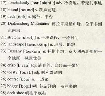 It’s a surprise to wake up to the sound of rain on our 19)deck, but it clears by the time we set off on our long journey to Cleopatra Mountain Farmhouse in the 20)Drakensberg Mountains. For large 21)stretches of the journey there is very little traffic on the road, which takes us from the north to the heart of South Africa, across countryside that seems to change constantly. It reminds us of the flat 22)landscape of Holland one minute and the rolling hills of 23)Tuscany the next. At last, after 10 hours of driving, we reach the farmhouse. The air is 24)crisp and chilly, but our cottage is25)toasty and there is a bottle of sherry waiting for us. In the morning, I open our door and am hit by the magnificence of the Drakensberg Mountains. Named “mountains of the dragon” by the original settlers, they smoke with clouds that swirl above them. With a six-26)course dinner to come, my wife, Jules, suggests some exercise would not be a bad idea so we decide to climb the mountain. The only problem, which hits me halfway up as I get stuck in the 27)boggy bank of a stream, is that my 28)deck shoes are made for boats rather than mountains. But eventually we reach the summit from where we can see across to other ranges, mighty and awe-inspiring.