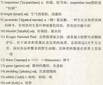 Our first stop is Cybele Forest Lodge, a5)retreat 6)tucked away on 300 acres of dense forest. It is only a three-hour drive from Johannesburg but the scenery is dramatically different, with deep green woodland and rivers and lakes replacing the arid grasslands. We pull into the drive and park under a large 7)turpentine tree that reaches across the courtyard. Inside, the lodge walls are painted in red; antiques are scattered around the rooms and heavy rugs on the old farmhouse’s stone floor. In the morning, we wake up late and have a lazy breakfast in the shade of the 8)bright purple9)jacaranda tree as butterflies dance around us.