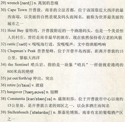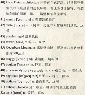 Easy though it is to lose track of time here, we 36)retire at a decent hour as I have planned a small tour of the wine-lands and don’t fancy doing this with a 37)hangover. Starting out along the leafy avenues in 38)Constantia, we drive first to the large, traditional farms, such as Rustenburg in 39)Stellenbosch, with their 40)Cape Dutch architecture. Then on to Tokara, a more modern 41)winery that overlooks a 42)vista of breathtaking beauty—perfectly lined rows of vines cover the slopes of 43)purple-tinged mountains that 44)tower over the countryside.