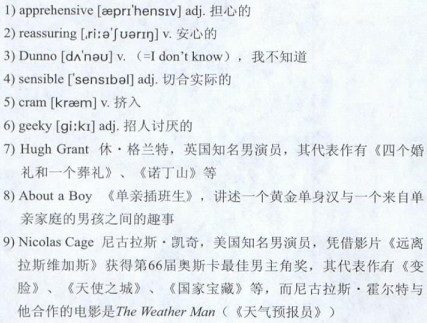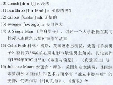 I say 2)reassuring things, but he looks unconvinced. Why do interviews make him panic? He frowns and seems to think hard.“3)Dunno,” he finally offers, unhelpfully. Hoult’s reaction is 4)sensible, really. No one wants to be 5)crammed on a sofa and asked annoying questions about how he feels and what he thinks, but it’s surprising that an actor this experienced hasn’t found a way to deal with the experience by now. Though he is just 21, he’s worked in film and TV for years. He was spotted in a theatre audience aged three by a director who suggested to Hoult’s mother that if he could concentrate on a play at that age then he could probably be in one. He’s been acting ever since, becoming properly famous at 12 as 6)geeky schoolboy Marcus opposite 7)Hugh Grant in the 2002 adaptation of 8)About a Boy. He’s co-starred with 9)Nicolas Cage, and then became a star in his own right at 17, thanks to Channel 4’s drugs-and-sex-10)drenched teen drama Skins. His portrayal of heartless 11)heartthrob Tony Stonem, full of 12)callous 13)swagger and vulnerability, was the show’s standout performance. Aside from that, he was lucky enough to participate in 14)A Single Man, alongside 15)Colin Firth and 16)Julianne Moore.