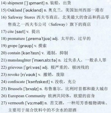 The BATF’s warnings prompted many wine sellers across the nation to remove Italian products from their shelves immediately. Among them was 15)Oakland-based16)Safeway Stores, which sold wine in some 1,200 supermarkets and 104 Liquor Barn stores. Said Safeway Spokeswoman Felicia del Campo: “Nobody could assure us that none of the adulterated wines had reached the U.S.” Many other retailers resisted the move, however, pointing out that they did not sell low-grade products, or 17)citing confidence in their own distribution systems. Said Louis Iacucci, president of Goldstar Wines & Spirits of Queens, N.Y., the nation’s single largest retailer of Italian wines: “The scare was 18)premature, and it has done a lot of harm to some of the great winemakers of the world.”