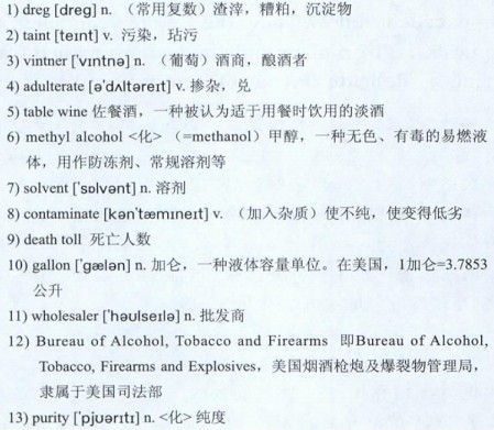 In the U.S., where some 73 million 10)gallons of Italian wine were imported every year and sales had been booming, federal officials warned 11)wholesalers and importers not to distribute any Italian wines until samples could be tested for methyl alcohol. Then the 12)Bureau of Alcohol, Tobacco and Firearms(BATF) advised drinkers not to touch Italian wines until tests showed that they were not contaminated. The Italian embassy emphasized that the only products that had so far been discovered to be tainted were cheap varieties that sold in Italy for about $1.50 per gallon.