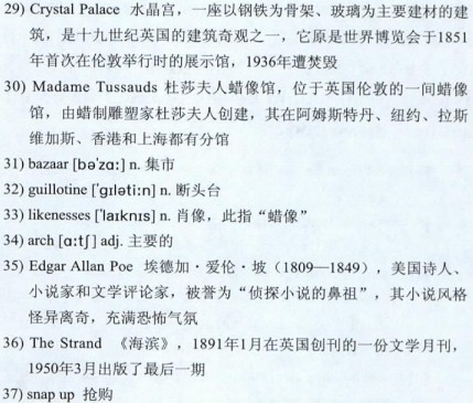 Conan Doyle first encountered London at the age of 15. Escorted around the city by his uncles, young Conan Doyle took in the Tower of London,28)Westminster Abbey and the 29)Crystal Palace, and viewed a performance of Hamlet at the Lyceum Theatre in the West End. And he went to the Chamber of Horrors at 30)Madame Tussaud’s wax museum, then located in the Baker Street 31)Bazaar (and on Marylebone Road today). Doyle viewed with fascination wax models of those who had died on the 32)guillotine during the French Revolution as well as 33)likenesses of British murderers and other 34)arch-criminals.