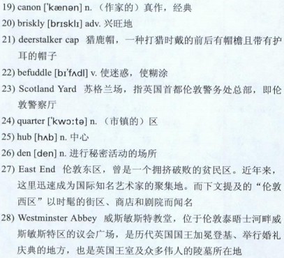 A persuasive case can be made that Holmes exerts just as much hold on the world’s imagination today as he did a century ago. The Holmesian 19)canon—four novels and 56 stories—continues to sell 20)briskly around the world. The coldly calculating genius in the 21)deerstalker cap, wrestling with his inner demons as he solves crimes that 22)befuddle 23)Scotland Yard, stands as one of literature’s most vivid and most alluring creations.