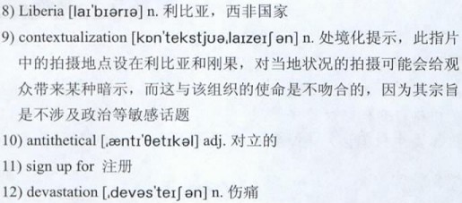 But that kind of 9)contextualization would have been 10)antithetical, both to the organization’s mission and to Mr. Hopkins’s own interest, which is in the particular challenges faced by individual doctors who 11)sign up for six-month tours in what they routinely describe as some of the worst places on earth. What we know about Liberia, for the purposes of the film, is that it recently emerged from a long, unimaginably brutal civil war of the kind that Congo is still suffering. This means that the 12)devastation the medical volunteers find in Liberia is 13)leavened by hope, and that the superior facilities that seem to exist in Congo are under constant threat of violence.