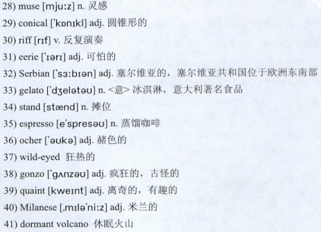That’s not to say the island lacks a softer, tourist-friendly side. In San Vincenzo’s main stone square, visitors will find a 33)gelato 34)stand and a cafe serving35)espresso in the shadows of an 36)ocher church from the 18th century. And around dusk every night, small gangs of 37)wild-eyed climbers, amateur geologists, and 38)gonzo tourists gather here.