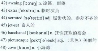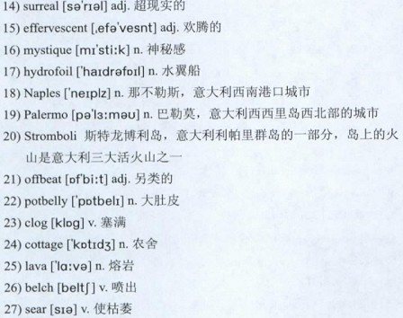 But not all of the Aeolian Islands are known for their hard, natural splendor. The smallest island, Panarea, which is about three times the size of Central Park, is famous for its 45)jet-set 46)bacchanal. The island may be lined with fragrant olive trees and 47)picturesque swimming 48)coves, but come August, it’s wall-to-wall49)aristocrats and playboys: 50)bold-faced names like Princess Caroline of Monaco, Prince William, and the fashion designer Roberto Cavalli.