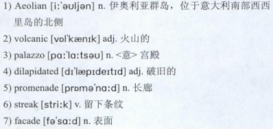The elegant, 19th-century 3)palazzo on the remote Italian island of Salina looked like any other 4)dilapidated building on the 5)promenade paved with slabs of volcanic stone. Water stains6)streaked down its weathered stone 7)facade and a blackened, cast-iron balcony was crammed with 8)rickety chairs.