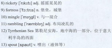 But then the 9)fortress-like wooden doors swung open and out walked a priest in white collar, a police chief, and several art collectors and curators. They 10)mingled with artists, fishermen, and curious passersby, sipping white wine while exploring the art in the palazzo’s 11)rambling chambers before squeezing up the narrow stairs to the roof for views of the 12)Tyrrhenian Sea and a distant volcano 13)spouting fire and smoke into the warm evening air.