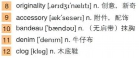 情景:今天我要和朋友们去“血拼”。一条小T恤裙。如果你喜欢的话,外穿一件牛仔布夹克,这样会让你显出一点腰身。我听说眼下木底鞋正流行。它们配起来还蛮好看的。而我觉得幸运符让人愉快。幸运符是为所有热爱生活和运气,热爱所有人生应该有的美好事情的人而设的。无论我们是谁,一个幸运符适用于我们所有人。你还想奢求什么呢?