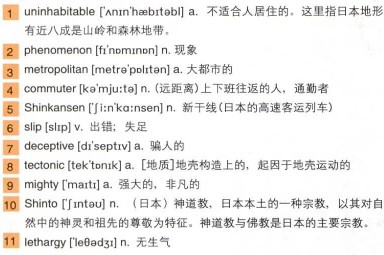 This 1)uninhabitable landscape has forced the population down into the coastal areas…and by doing so, created a futuristic 2)phenomenon. Tokyo, the capital, 35 million people live and work here. It’s the largest 3)metropolitan area in the world. Getting this vast sea of 4)commuters to and from work requires a vast and efficient transport network. Fifty thousand taxis, a subway system that moves eight million people a day. The 5)Shinkansen bullet trains run so precisely that over a year their timetable 6)slips by just 36 seconds. But the most surprising commuter route is by air. The domestic flight from Saporo to Tokyo is the busiest air route in the world, carrying almost 10 million commuters a year. Organizing so many passengers requires futuristic thinking. Instead of old-fashioned tickets, why not use your cell phone?