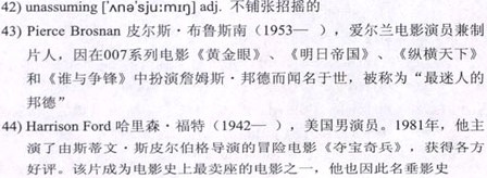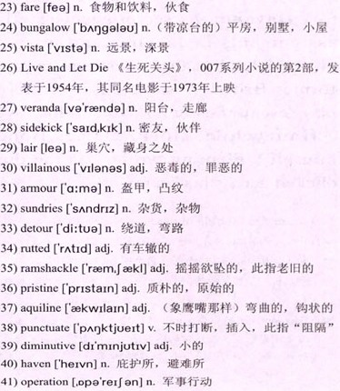 Fleming’s 40)haven was Goldeneye, named for a wartime 41)operation he was involved in, and now one of the most exclusive resorts on the island. Situated in the small town of Oracabessa, once a banana port, Goldeneye is an 42)unassuming patch of land with stone paths and trees planted by former famous guests. Handwritten signs mark the mango planted by 43)Pierce Brosnan, the lime tree by 44)Harrison Ford, the royal palms by the Clintons. Set among them are three villas that, with Fleming’s original house and a restaurant overlooking the ocean, make up the current property. Where the restaurant sits, a 45)gazebo once stood. Fleming liked to take notes in it.