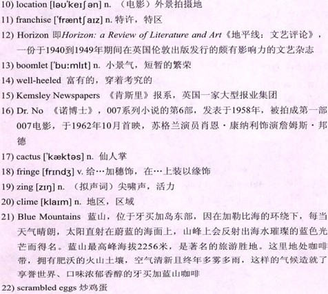 When Fleming made his first visit to the island 65 years to the month when I was there, he chose to stay in the cooler 20)climes of the 21)Blue Mountains. I followed his lead that evening and took the B1 road, which curls itself up into the mountains. My destination was Strawberry Hill, an 18th-century coffee plantation turned resort owned by Chris Blackwell, the founder of Island Records. Over a breakfast of 22)scrambled eggs and Blue Mountain coffee (the same morning 23)fare Fleming preferred and Bond nearly always enjoyed) on the balcony of a private 24)bungalow, guests overlook the same 25)vista Bond did in 26)Live and Let Die, where he “had his breakfast on the 27)veranda and gazed down on the sunlit panorama of Kingston.”