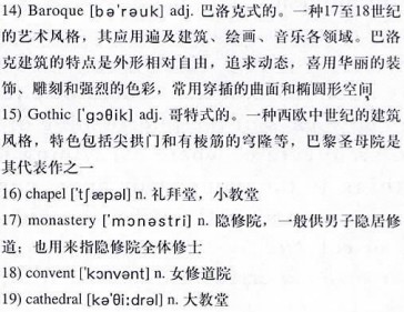Granada houses are Spain’s best Moorish constructions, the most magnificent of which is the Alhambra. This old fortress with palaces and gardens perches above the hillside town with a snowy 12)vista of the 13)Sierra Nevada mountain range in the background. There are also 14)Baroque churches, 15)Gothic 16)chapels, 17)monasteries, palaces, 18)convents and 19)cathedrals.