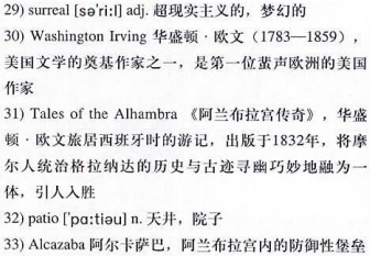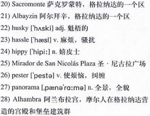Two grandmothers with enough colored hair clips to keep an army of small girls happy, a man playing a guitar, two gypsy girls 26)pestering the tourists, and the hazy 27)panorama of the famous 28)Alhambra and the Sierra Nevada mountains behind. The moment was so 29)surreal, I lost myself for two hours, and have only moved since then to this bar where I am almost unable to leave my chair.
