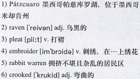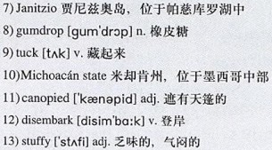 My husband, Eric, and I were visiting 7)Janitzio—a tiny, 8)gumdrop-shaped island on 15-mile-long Lake Pátzcuaro, 9)tucked among volcanic mountains in Mexico’s 10)Michoacán state. The houses, churches and other buildings on the island seemed squeezed, as if by a giant grip, pressing skyward. We had approached Janitzio on a long, wooden, 11)canopied boat filled with three dozen passengers, mostly Indians returning from their marketing chores in the lakeside town of Pátzcuaro, and a few Mexican tourists.